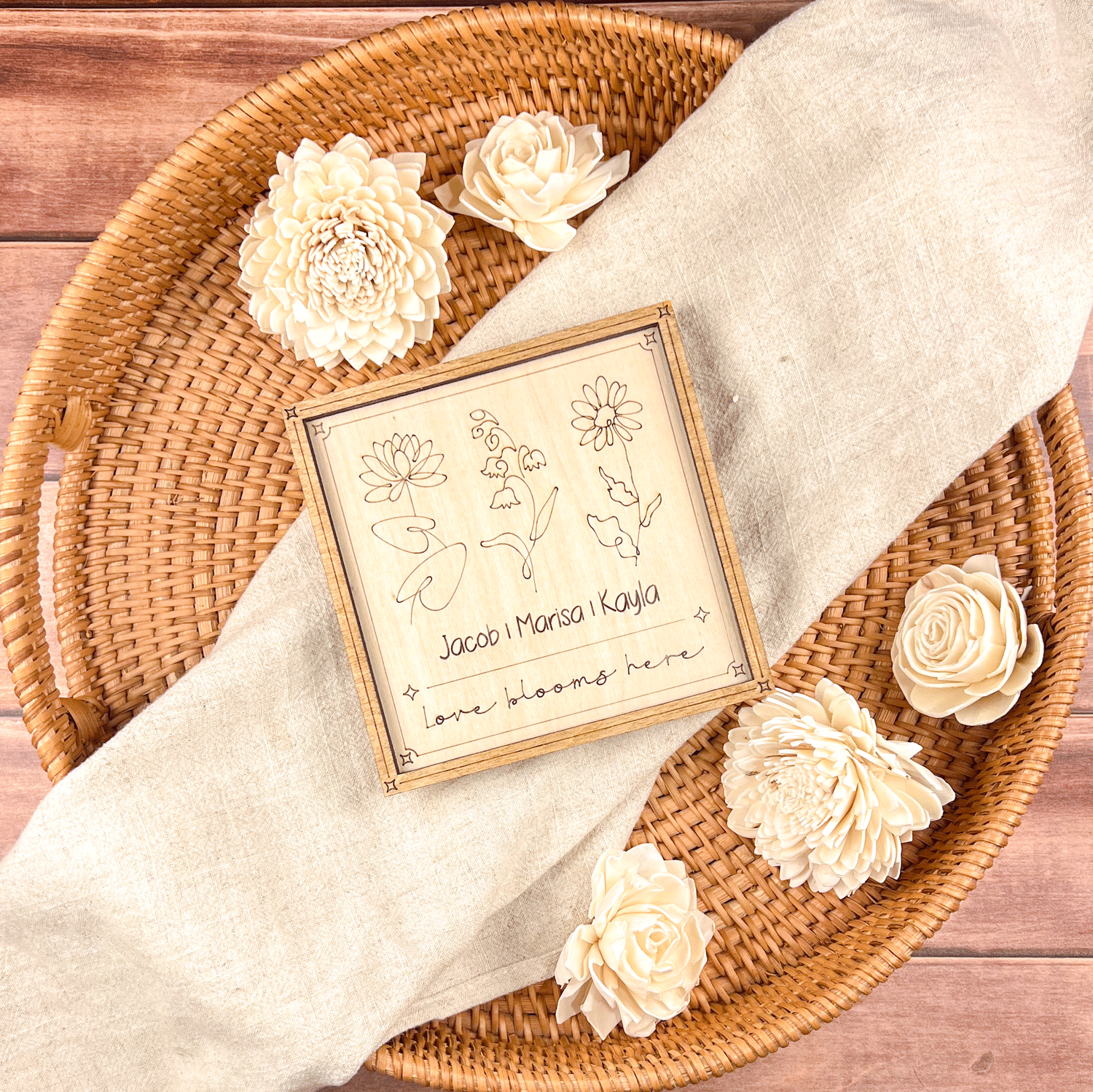 Custom engraved with names and flowers