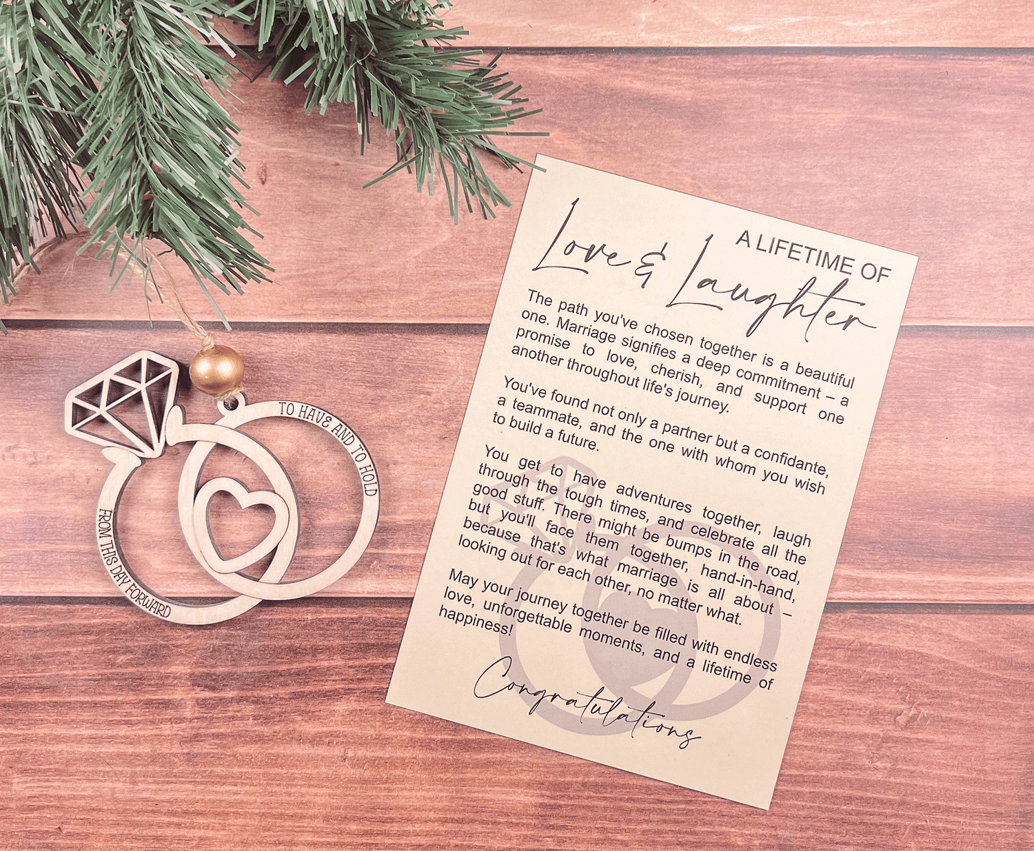 Paired with a touching card filled with words of love and encouragement, this keepsake is the perfect way to celebrate a wedding, engagement, or anniversary. Imagine the joy on their faces as they unwrap this thoughtful gift, a tangible reminder of their vows and the adventures ahead. Whether displayed on their Christmas tree, kept as part of their wedding decor, or hung lovingly in their home, this ornament will serve as a lasting symbol of their love and commitment.