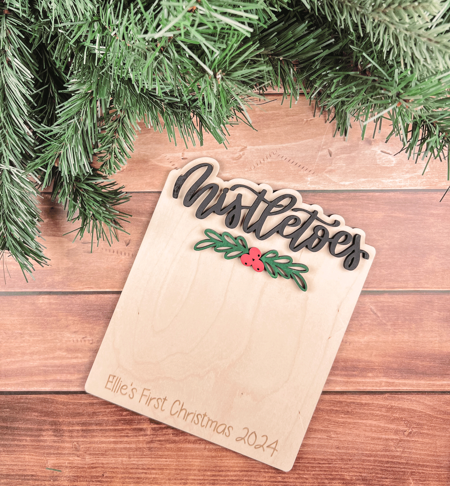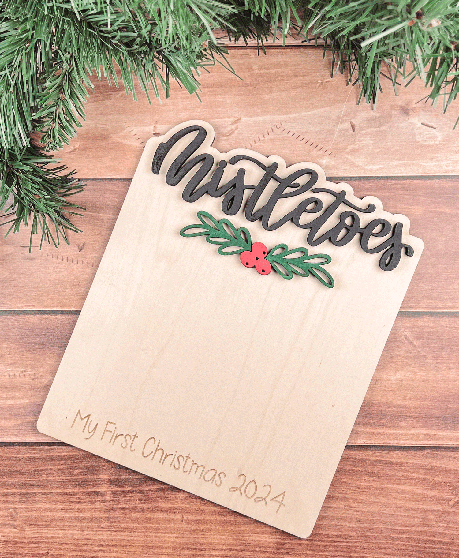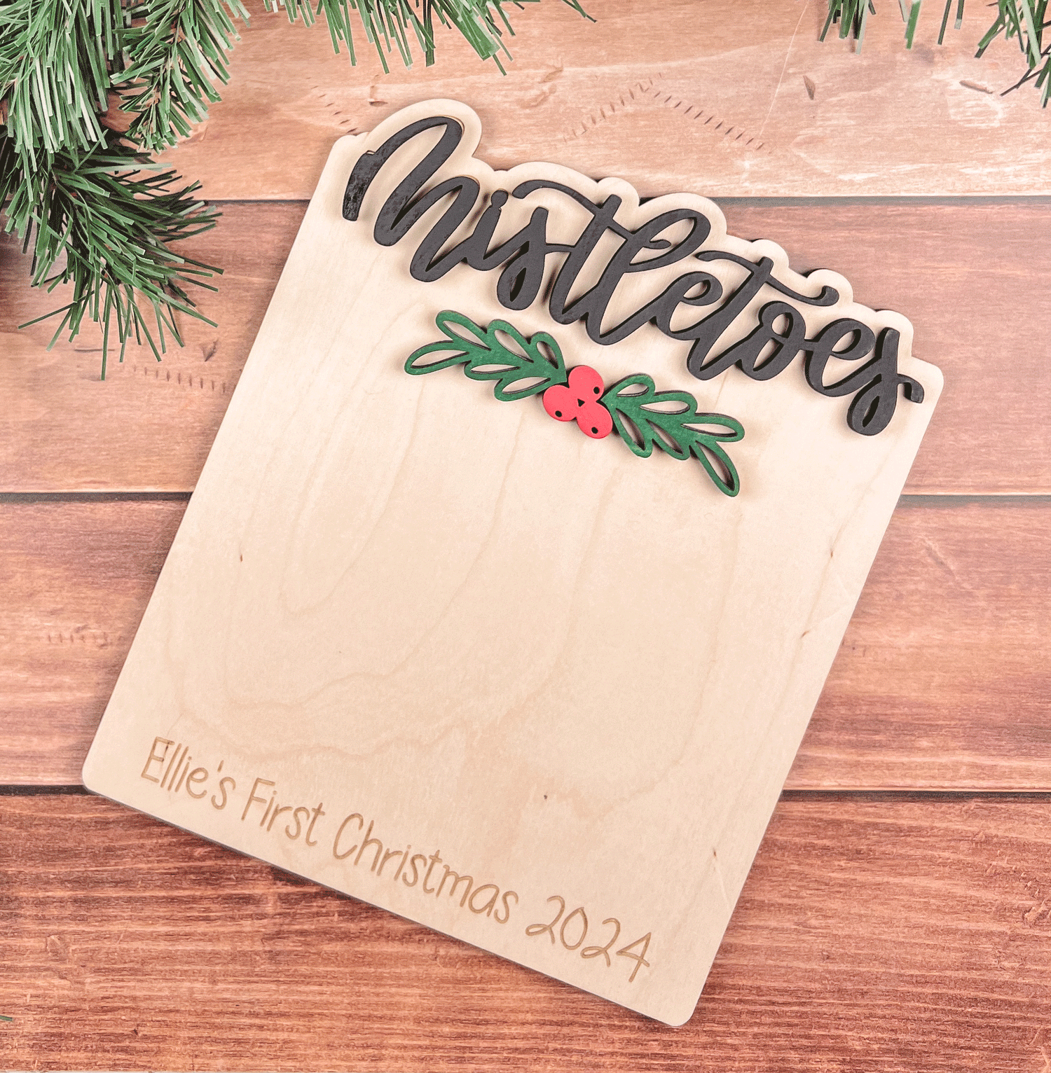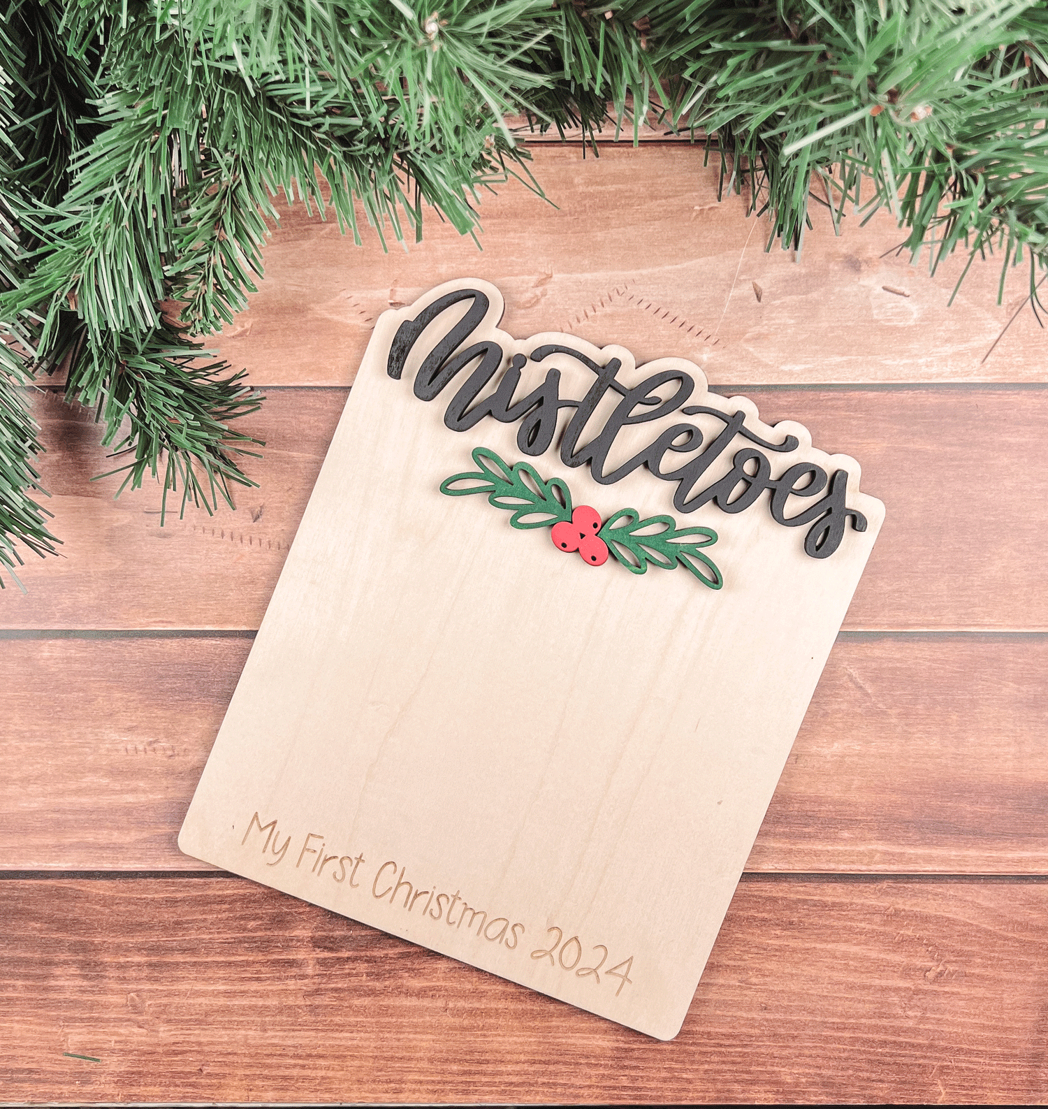 Designed to evoke warmth and joy, the festive mistletoe and holly accents bring a touch of holiday charm to your home. Measuring 9"x7", it’s the perfect size to display on a mantle, shelf, or wall, where it will serve as a loving reminder of your baby’s first holiday season. Imagine looking back on this sign years from now, remembering how small and cherished your little one was during their first Christmas.