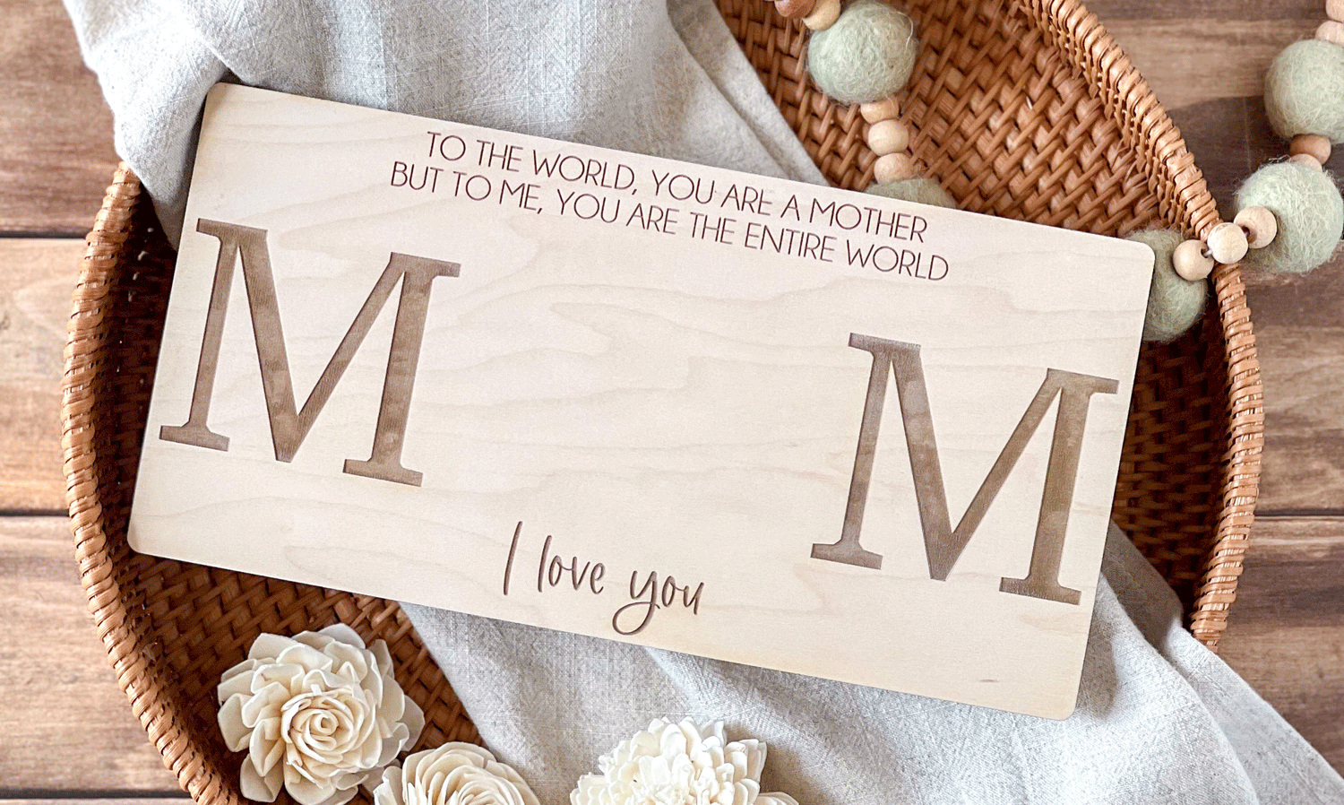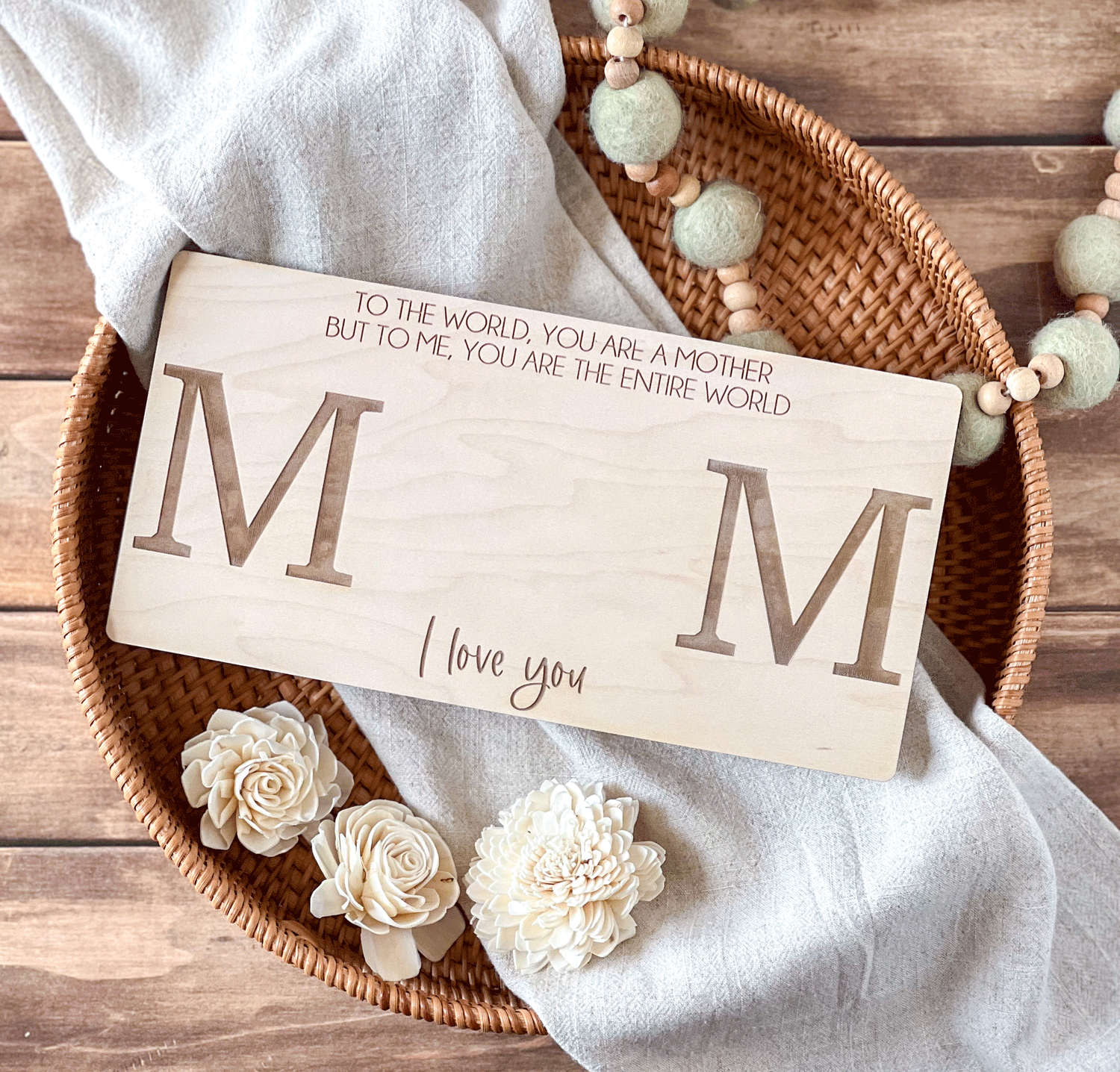 Introduce your mom to an unmatched heartfelt expression of love with our 11"x5.5" Mother's Day Wood Sign. Engraved on natural maple plywood, this sign immortalizes the precious bond between a mother and a child. Perfect for Mother's Day, birthdays, Christmas and simply 'just because' moments; it's an exceptional gift that says 'to the world you're a mother but to me, you're the world'. With a space for your child's handprint, this gift could not get any more personal!