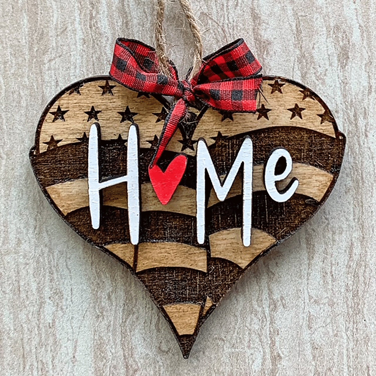 The ornament is laser engraved and cut out of birch, hand-sanded, and stained to give it a rustic feeling. The word Home is also cut from birch, hand-sanded, and painted for the unique 3D look. Finishing touches include a red buffalo plaid bow and jute to be used as a hanger.
