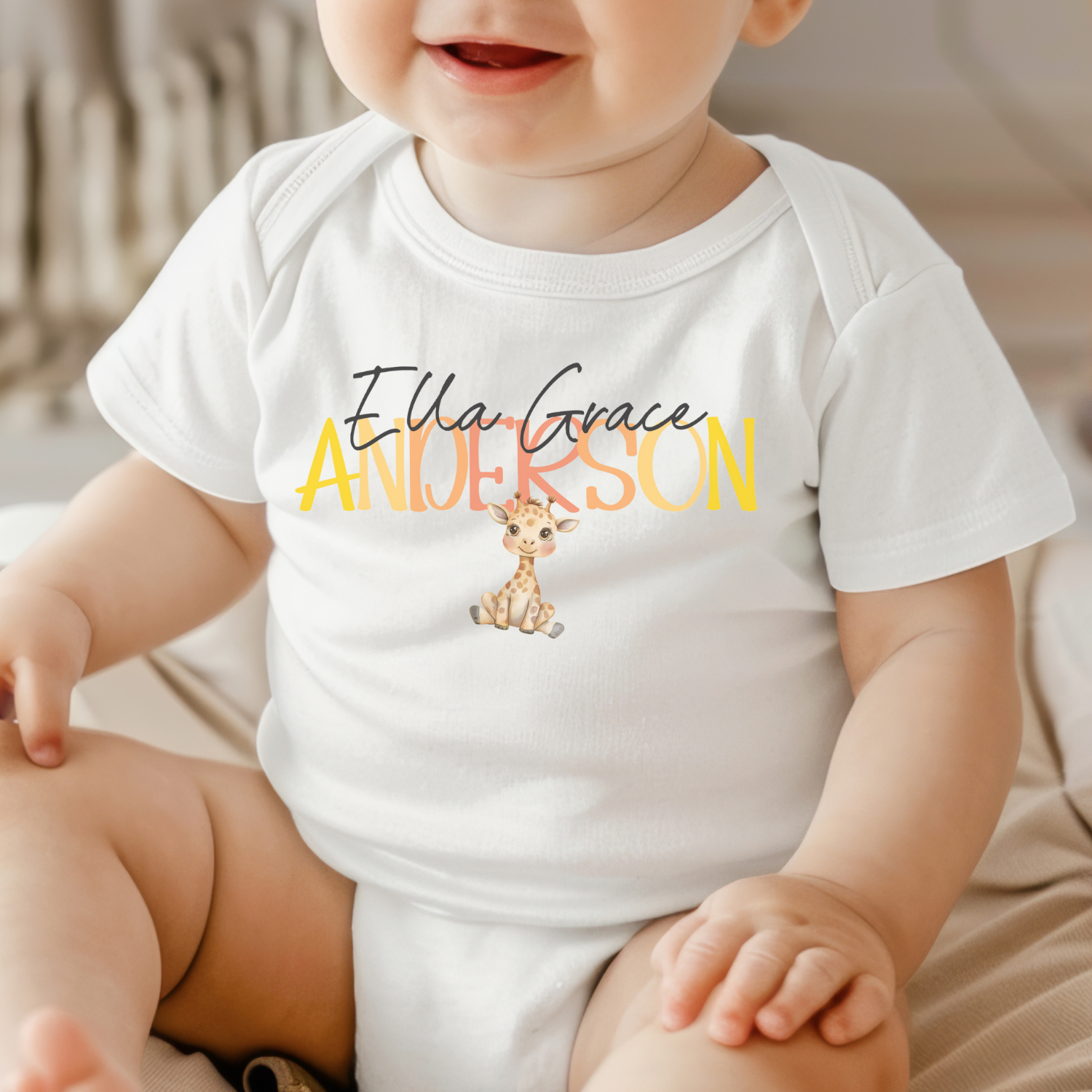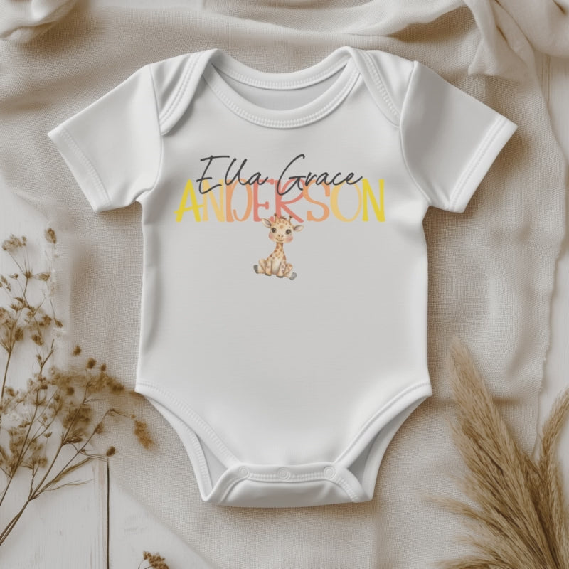 Introducing our delightful baby bodysuit, a must-have for your little one's wardrobe! Made from soft, breathable fabric, this short-sleeved white bodysuit is gentle against your baby's delicate skin, ensuring comfort throughout the day. The standout feature of this bodysuit is the stunning printed design, showcasing the name "Ella-Grace Anderson" in an elegant black script and a vibrant gradient of warm colors transitioning from orange to yellow. Below the name, a charming watercolor-style illustration of a sitting baby giraffe adds an adorable touch, making this bodysuit not only fashionable but also uniquely personal.