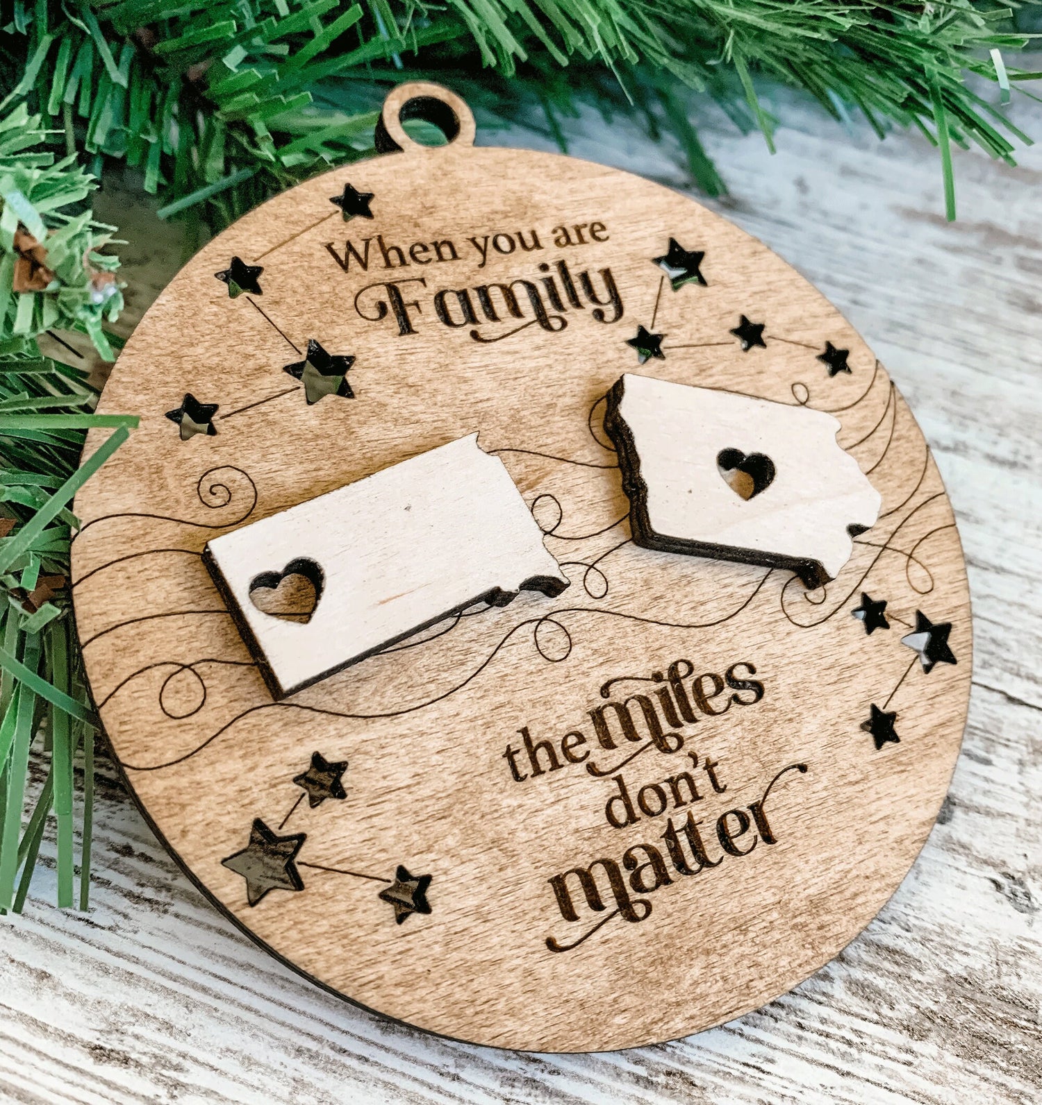 This ornament can be made with your choice of states and if desired a heart can be added to the state in a location near your family’s city. This ornament is 2 layers, one layer is a stained base that is engraved with a beautiful quote and the second layer is the desired states.