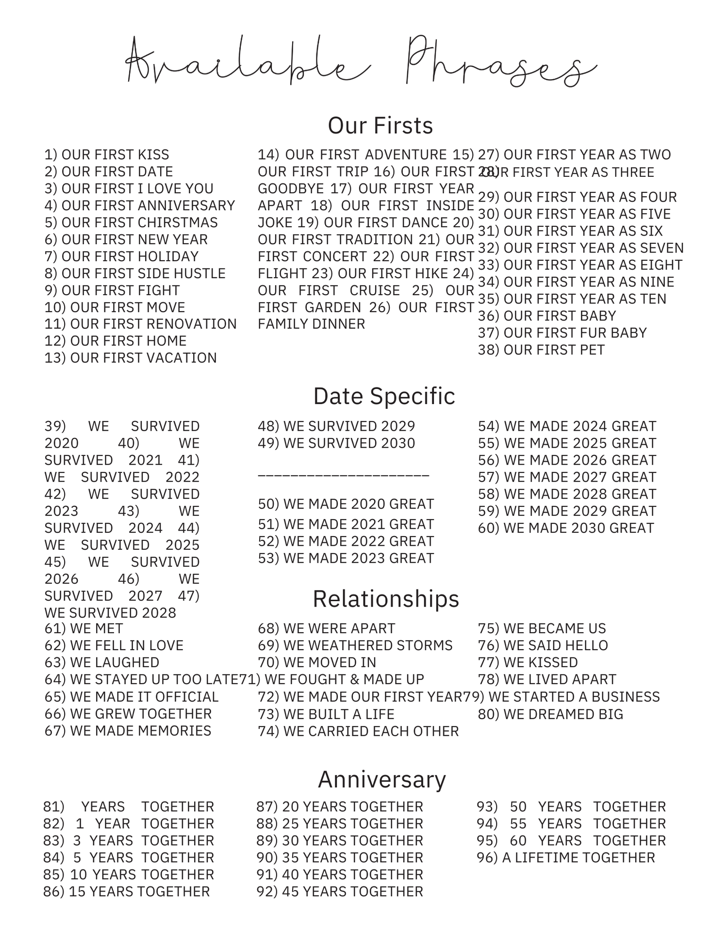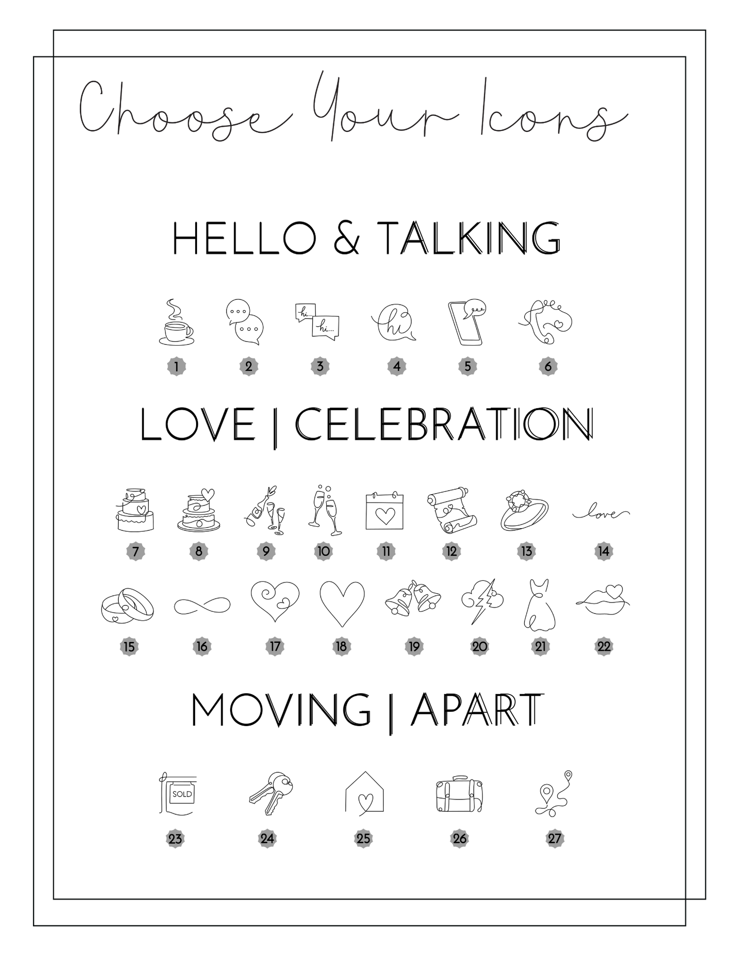 Customize names, milestone titles, and coordinating icons to create a meaningful keepsake that celebrates your love. Options are 6 OR 8 love story icons