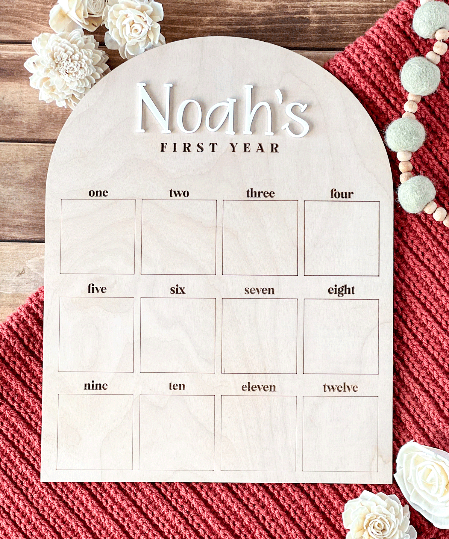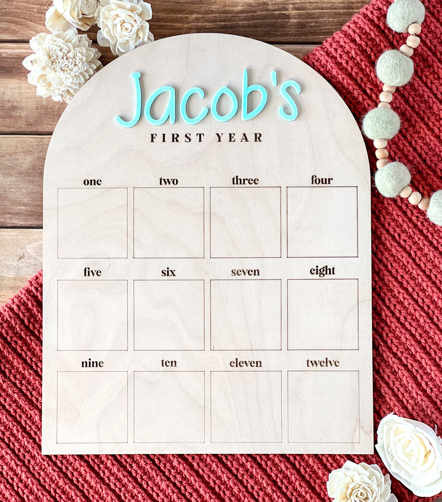 Each board features twelve squares, one for each month of your baby's journey, allowing you to display adorable photos capturing their growth and milestones. The top of the board can be personalized with your baby's name, adding a special touch to this cherished memento.