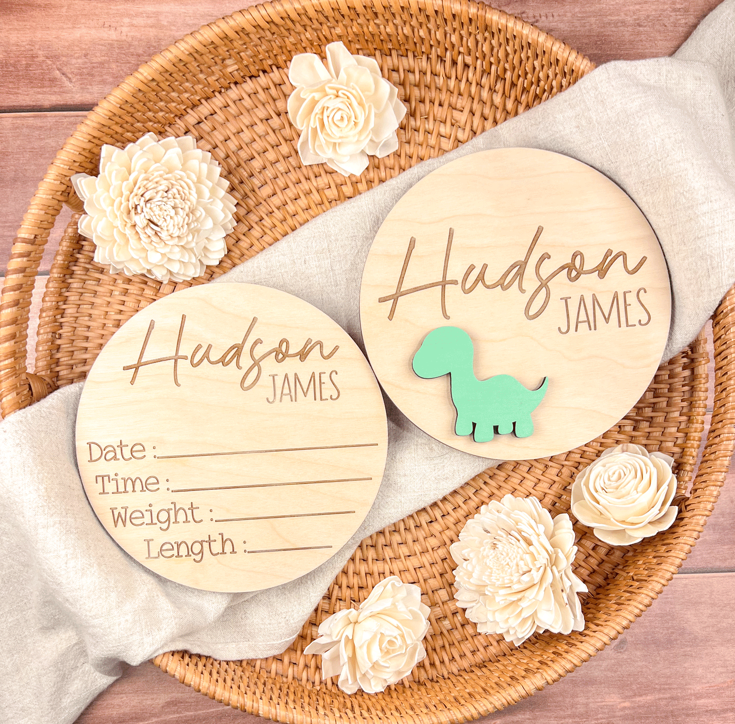 Welcome your little one with this custom wooden birth announcement sign, the perfect way to introduce your baby to the world! Featuring a beautifully engraved name and space to record birth details, this keepsake captures those first precious moments in a timeless design. The adorable dinosaur accent adds a playful and unique touch, making it a charming addition to any nursery decor.