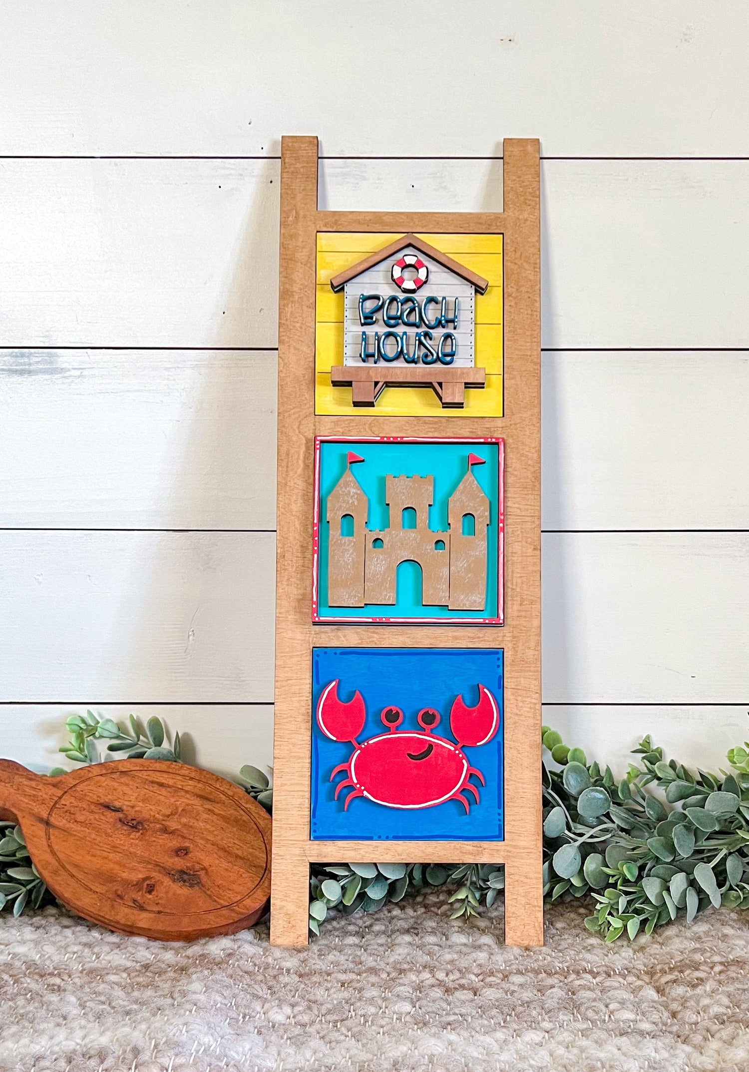 Are you looking for a cute way to decorate your home without having to store a bunch of bulky items? Our interchangeable ladder and fun tiles would be perfect for you. The ladder can hold up to 3 different tiles which can be changed regularly to suit your mood or holiday. Many use our ladders in their kitchen, bath, or on a shelf.