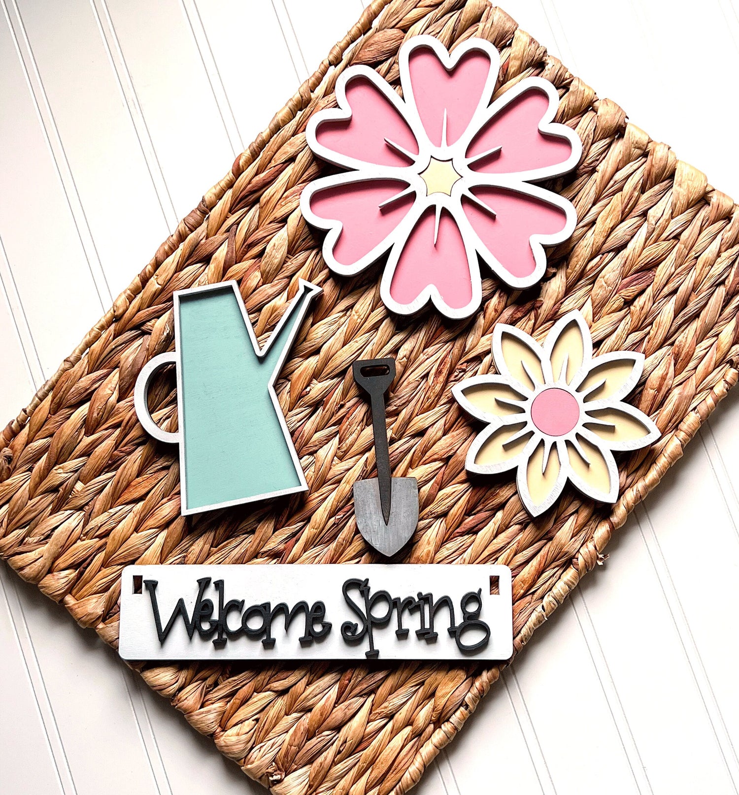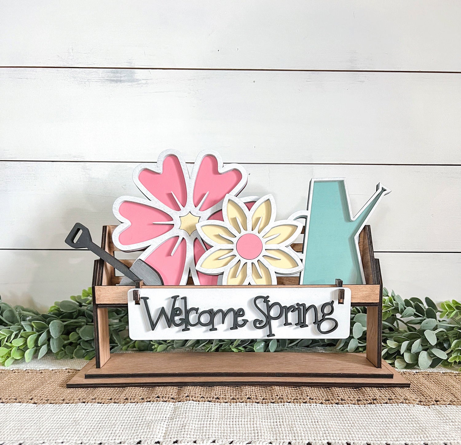 Welcome Spring Shelf Sitter Decor for Unique Kitchen Farmhouse Decor Tiered Tray Decor, Coffee Bar Decor
