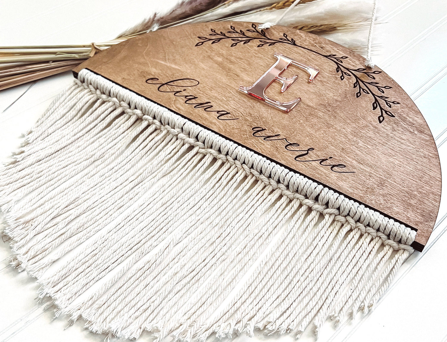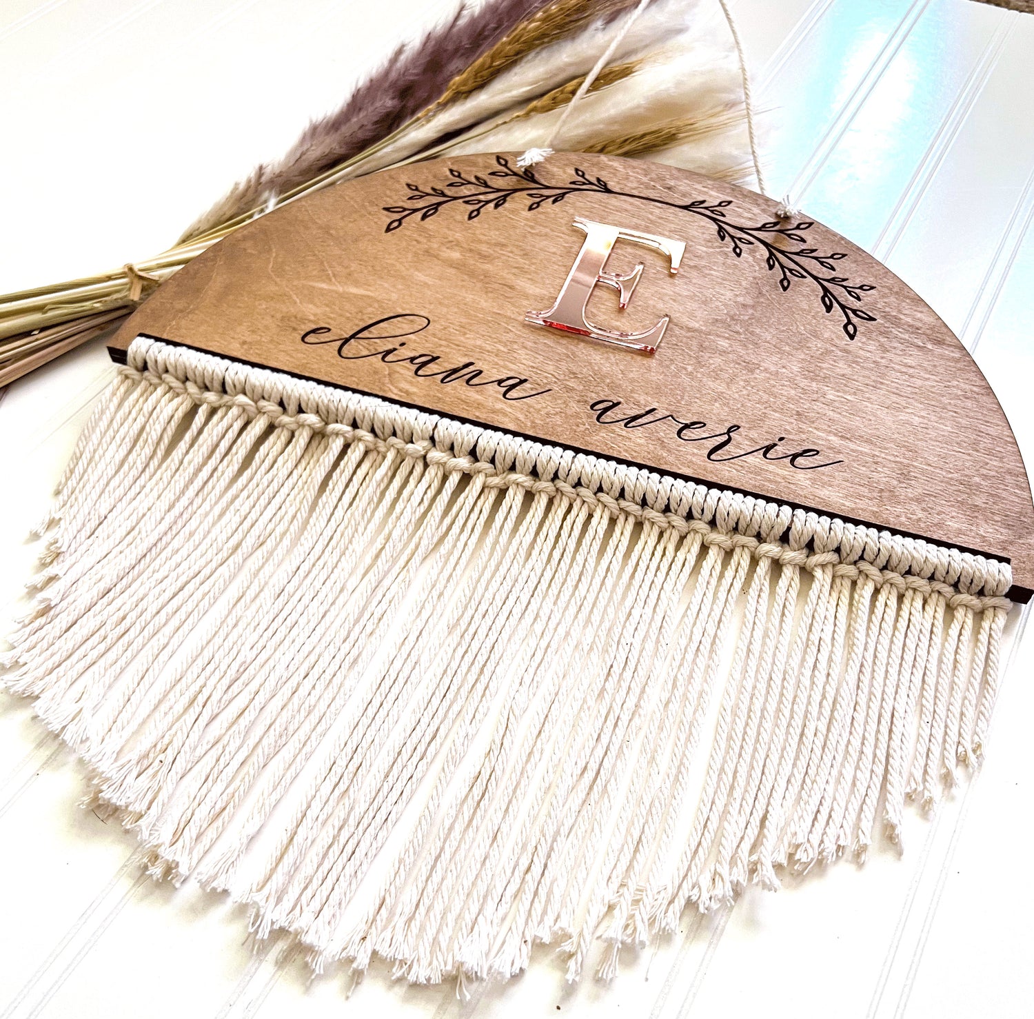 This sign is made with 2 layers of ¼’ birch, is stained and engraved with a beautiful floral pattern, and your baby’s name. The letter is cut from a beautiful rose gold acrylic and the sign is completed with a cotton macrame cord to give it the comfy boho feel.